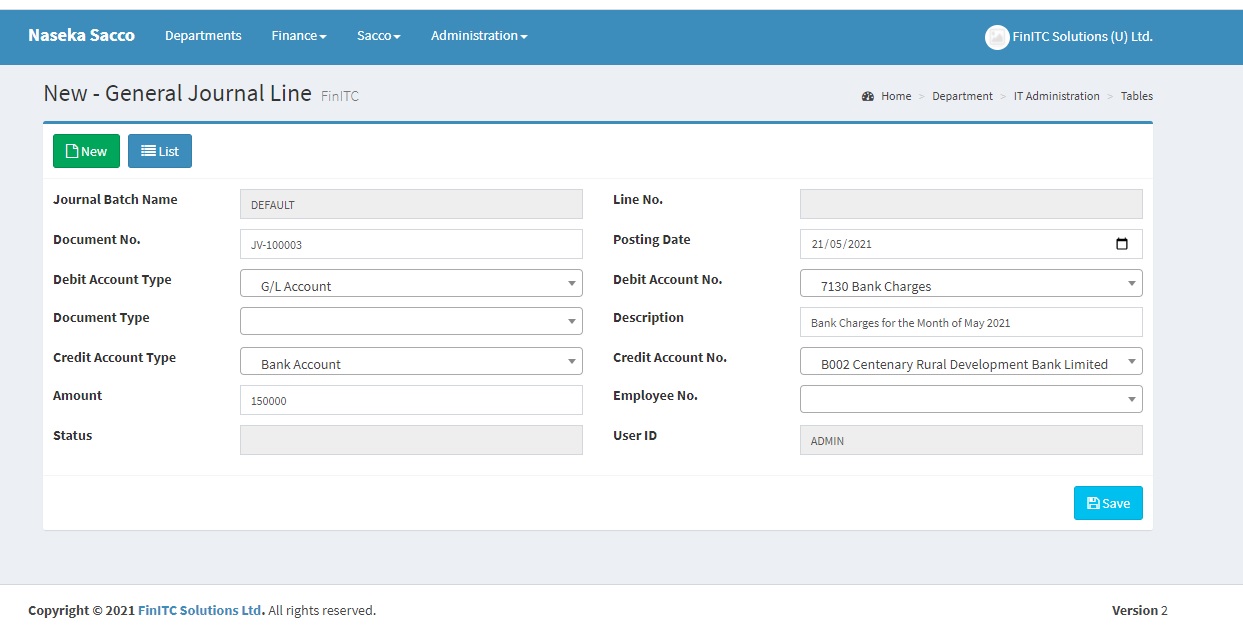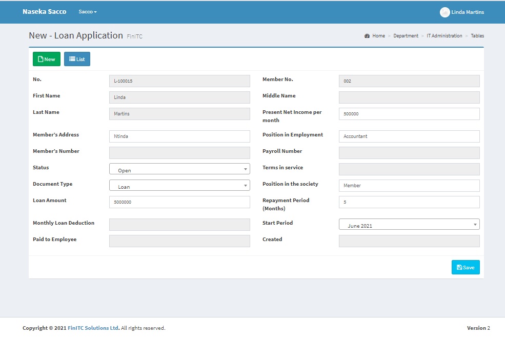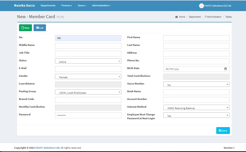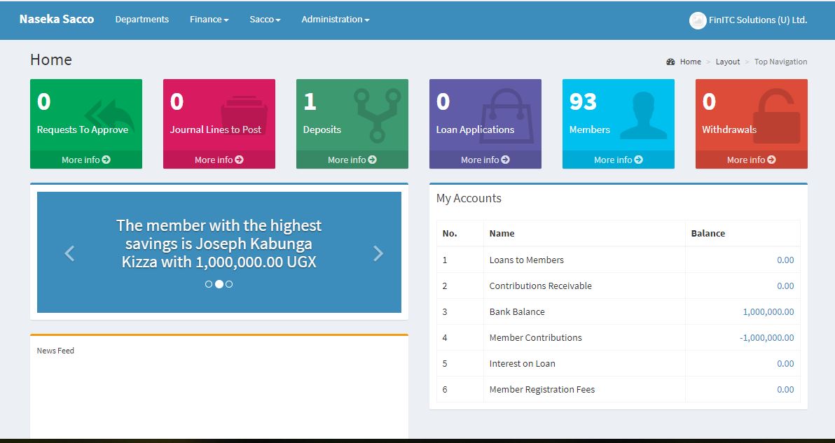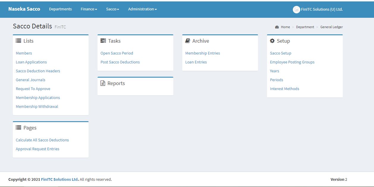 The FinITC Sacco Management System is a fully integrated relational database system that lets you enter and maintain financial and other sacco business activities in one place. The FinITC Sacco System has modules such as General Ledger, Receivables, Cash Management, Loan Management and Investments.