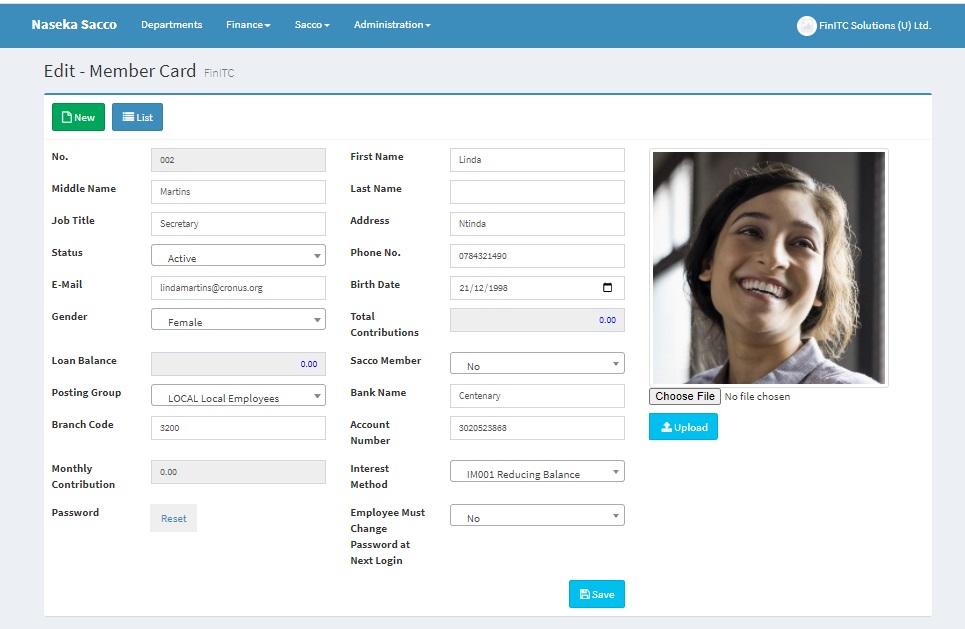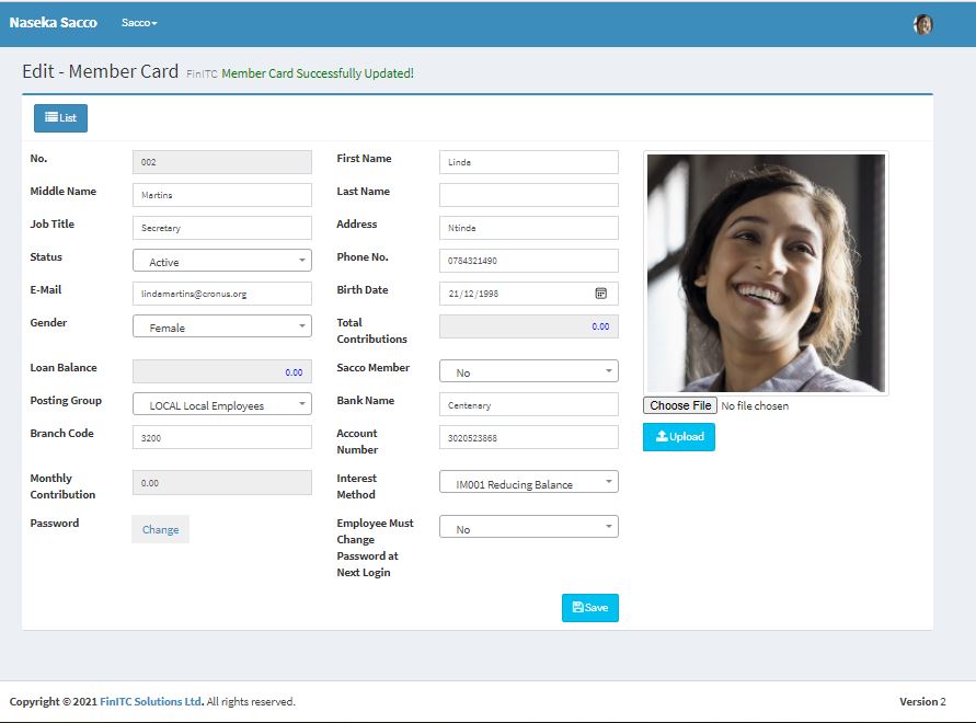Use the Member No./Payroll ID/Employee No., provided by the Sacco Administrator and the default password to log on to the system. The system will prompt you to change the password at first login. Once the password has been changed, Click Sacco under the top navigation bar > Sacco Details. Select My Profile from the Setup group. Click the Pencil/Edit icon to update your member profile and finally click save. You can also choose a picture from your local computer and upload it to your profile as shown below.
