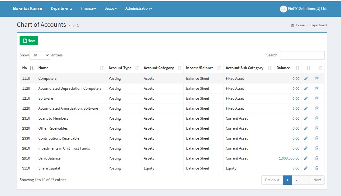 The Chart of Accounts provides quick access to G/L Accounts and balances. This is the heart of the Sacco Management System. Every process executed in the Sacco Management System ends up in the Chart of Accounts