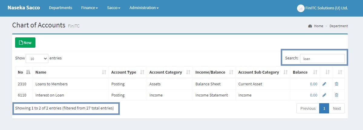 You use the filter box to display accounts, members, entries, or other records by specifying criteria for fields in a table. The example below searches and filters out all G/L accounts with a word Loan