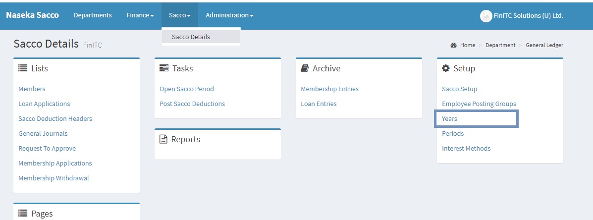 Items on the navigation bar are grouped into Lists(working data), pages (filtered working data), tasks (actions to perform), reports (analysis of data), archive (historical information) and setup (application area configuration settings). Below are the Sacco Details menu items.