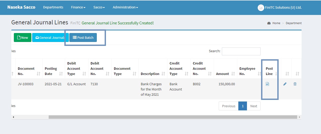 Users can create and post journal entries. To enter lines in a general journal, On the navigation bar, click Finance > General Ledgers > General Journals. Click the Number in the "Edit Journal" column. This will open the selected General Journal Batch. Enter the relevant fields and click Save.