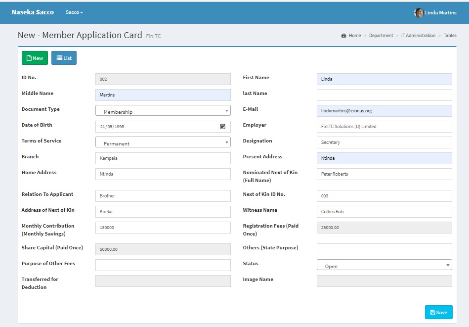 As the accountant manager at Naseka Sacco, you are responsible for setting up new members. A new member, Linda Martins, has contacted your SACCO and requested to start saving with the Sacco. You have agreed on the SACCO policies and you must create a member card for the member in the database so that receiving of membership fees can start. Refer to Section 2.2: Create an Account.