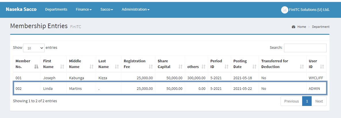 Once the Application for membership has been approved, the system will crate a membership entry. This can be seen by clicking Sacco > Sacco Details, and then selecting Membership Entries under the Archive group. The membership entry with "Transferred for Deduction" set to No will be suggested by the system while computing the monthly deduction schedule for the Period ID also specified in the same membership entry.