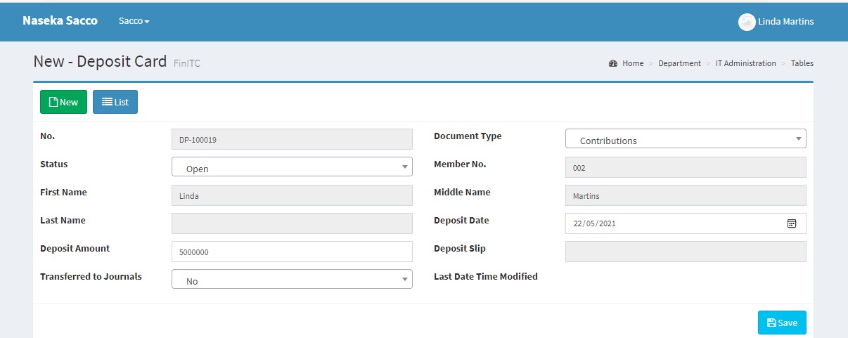 Money can be deposited on the SACCO account either by using Mobile Money or through the Bank. Once the transaction has hit the SACCO account, the SACCO administrator can register the transaction through the journals to reflect in the SACCO ledgers. Alternatively, the SACCO member can also register the transaction by clicking "Sacco > Sacco Details" and then selecting "Deposits" under the list Group. Click New , populate the required fields and click save.