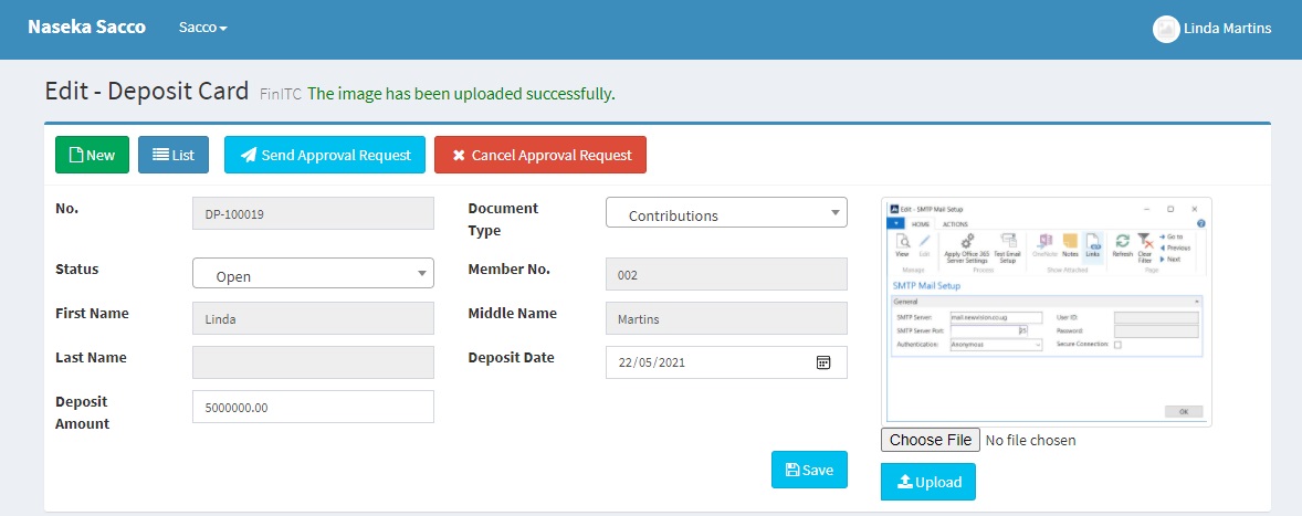 In order to send the contribution/deposit for approval, edit the Deposit by click the pencil/edit action and attach a deposit slip or screenshot if it is an online payment. Click Send Approval Request. The Approval process is the same as that already discussed in 7.5. Approve Requests.