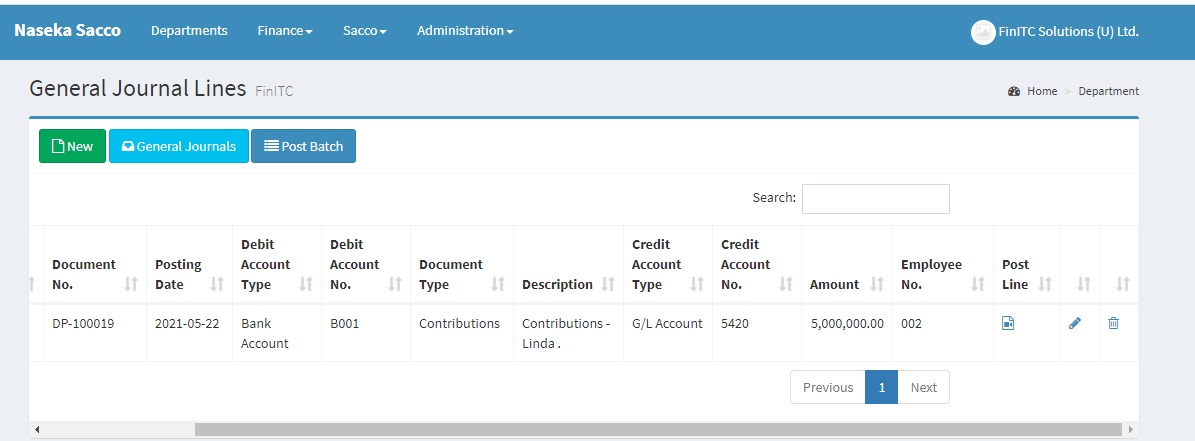 When the contribution/Deposit is approved by the Sacco Accountant, the system automatically generates General Journal Lines in the Contribution batch. These journal lines can be accessed by Clicking Finance > General Ledger > General Journals. The Edit Journal column will show the number of entries created. Click on that number to open the journal. The system debits the Bank Account (Asset) and credits the Member Contributions Account (Income). It also attaches the Member No. as shown in the figure below. Posting the entry to have the balance reflect on the member statement. Refer to section 5.3. Post General Journal Line.